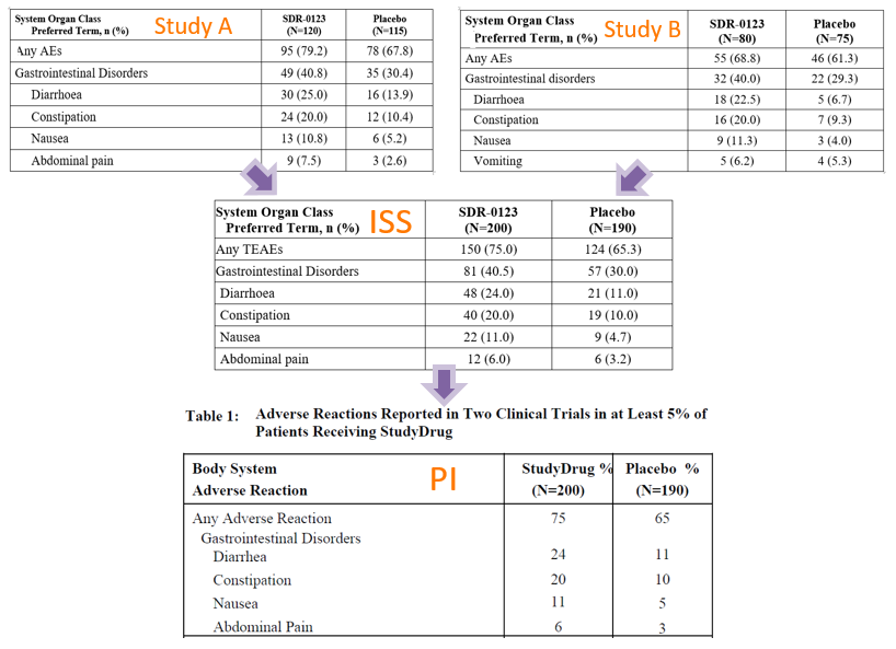 The Integrated Summary of Safety (ISS; usually only for US FDA submissions) and/or the Summary of Clinical Safety (SCS) compile safety data across studies for assessment. The premise is that the more data points available, the more likely a true reaction or effect will be observed. The table of ARs presented in a PI usually shows, in percentage of subjects, the suspected ARs of a product. Of course, we must keep in mind that safety data from clinical trials represent effects found in only a small fraction of potential users, in controlled situations. Consequently, ARs first presented in the PI are always considered potential. Over time, as a drug or biologic becomes more widely used in the greater population and/or more research is done, the nature of ARs becomes more certain. The following images show the derivation of the ARs presented in a PI from the ISS submitted in the NDA, and, in turn, from the Clinical Study Reports (CSRs) of the pivotal trials in the development program. Notice that in Study B, the AE ‘vomiting’ made the 5% occurrence cut-off determined to be meaningful in these studies. However, once data were pooled with the data in Study A, vomiting did not make the 5% cut-off. In the reverse situation, ‘abdominal pain’ was not so prevalent is Study B but was prevalent overall, in the pooled data.